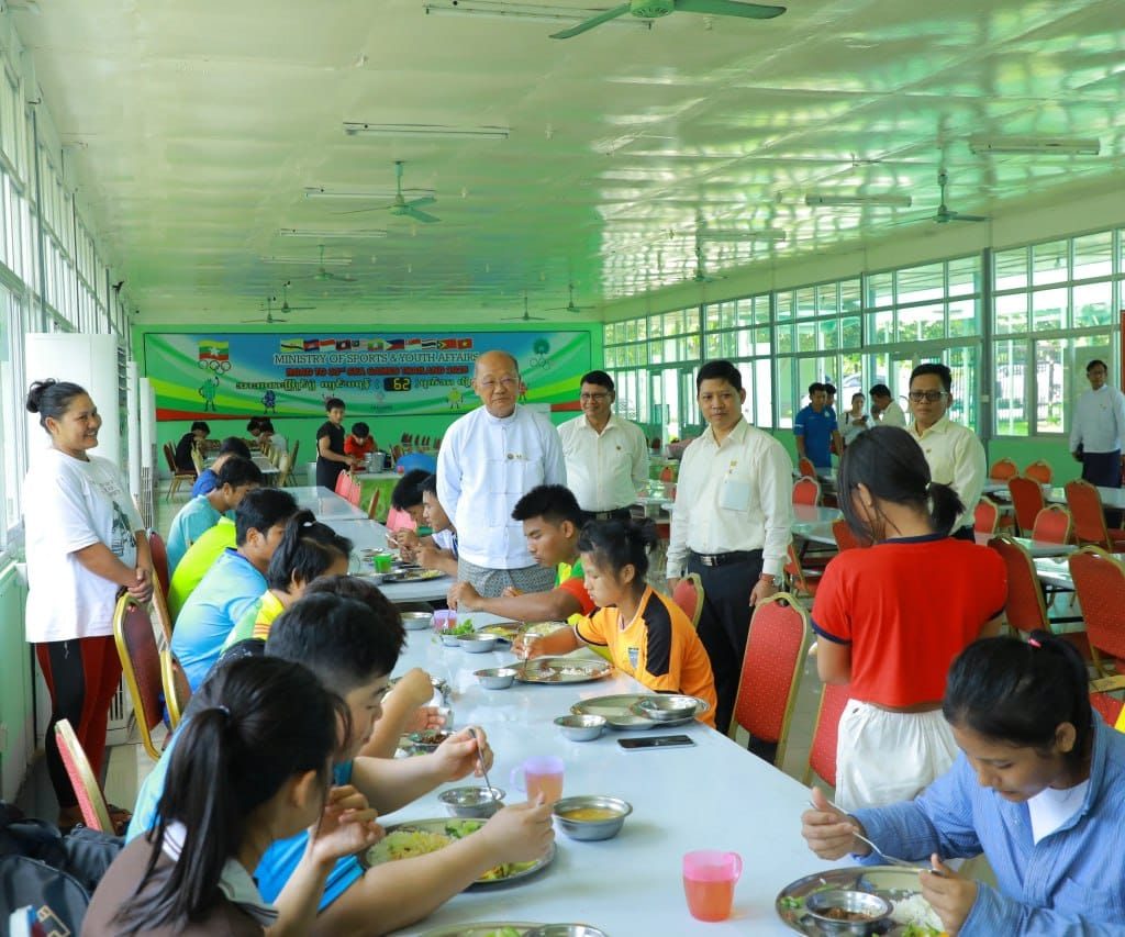 ထို့နောက် ပြည်ထောင်စုဝန်ကြီးသည် စားရိပ်သာ၌ အားကစားသမားများ၏ နေ့လည်စာ စားသောက်နေမှုများကို လိုက်လံကြည့်ရှုစစ်ဆေးခဲ့ပြီး Sports Nutrition နှင့်အညီ အားကစားသမား များအတွက် တစ်နေ့တာလိုအပ်သည့် ကယ်လိုရီပမာဏအတိုင်း တွက်ချက်၍ အလေအလွင့် မဖြစ်စေရန်နှင့် အာဟာရပြည့်ဝစေရန်အတွက် သန့်ရှင်းလတ်ဆတ်သည့် အသား၊ ငါးများကို ချက်ပြုတ် ကျွေးမွေးသွားရန် တာဝန်ရှိသူများကို မှာကြားခဲ့ကြောင်း သိရသည်။