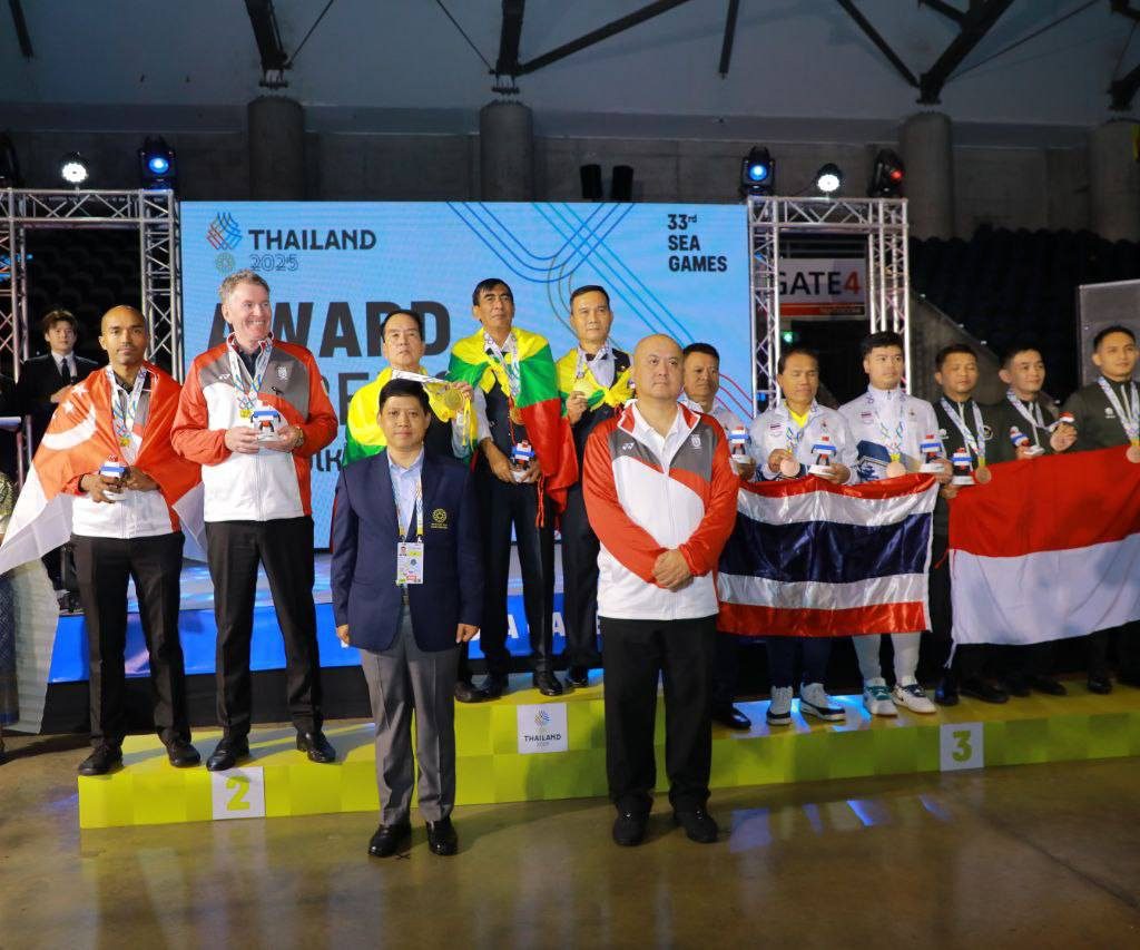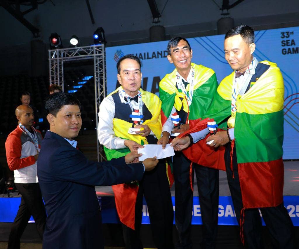 မြန်မာအားကစားအဖွဲ့အနေဖြင့် ဒီဇင်ဘာလ ၁၄ ရက်နေ့ ပြိုင်ပွဲ ပွဲစဉ်များဖြစ်သည့် ဘိလိယက်နှင့် စနူကာအားကစားနည်း အမျိုးသား ဘိလိယက်အသင်းလိုက်ပြိုင်ပွဲတွင် မြန်မာအသင်းမှ ဦးပေါက်စ၊ ဦးအောင်ဌေးနှင့် ဦးနေသွေးဦးတို့အတွဲက စင်ကာပူအသင်းကို သုံးပွဲ၊ တစ်ပွဲဖြင့် အနိုင်ရရှိပြီး မြန်မာနိုင်ငံ အတွက် တတိယမြောက်ရွှေတံဆိပ်ဆုကို ထိုက်ထိုက်တန်တန်ဖြင့် ထပ်မံဆွတ်ခူးရယူပေးနိုင်ခဲ့သည့် အတွက် အားကစားနှင့်လူငယ်ရေးရာဝန်ကြီးဌာန ပြည်ထောင်စုဝန်ကြီးကိုယ်စား မြန်မာအားကစား အဖွဲ့ခေါင်းဆောင် အားကစားနှင့်ကာယပညာဦးစီးဌာန ညွှန်ကြားရေးမှူးချုပ် ဦးဉာဏ်ဇော်ဦးက USD $ 300 အားလည်းကောင်း၊ ရန်ကုန်တိုင်းဒေသကြီးအစိုးရအဖွဲ့ လူမှုရေးရာဝန်ကြီး ဦးဌေးအောင်က ထိုင်းဘတ်ငွေ တစ်သောင်းအားလည်းကောင်း၊ ကမ္ဘောဇဘဏ်လိမိတက် နာယက ဦးအောင်ကိုဝင်း က ထိုင်းဘတ်ငွေ သုံးသိန်းအားလည်းကောင်း၊ ထိုင်းနိုင်ငံဆိုင်ရာ မြန်မာသံရုံးမှ ဦးစိုင်းရွက်ခေးက USD $ 300 အားလည်းကောင်း ဂုဏ်ပြုချီးမြှင့်ငွေများကို အသီးသီး ပေးအပ်ချီးမြှင့်ခဲ့သည်။