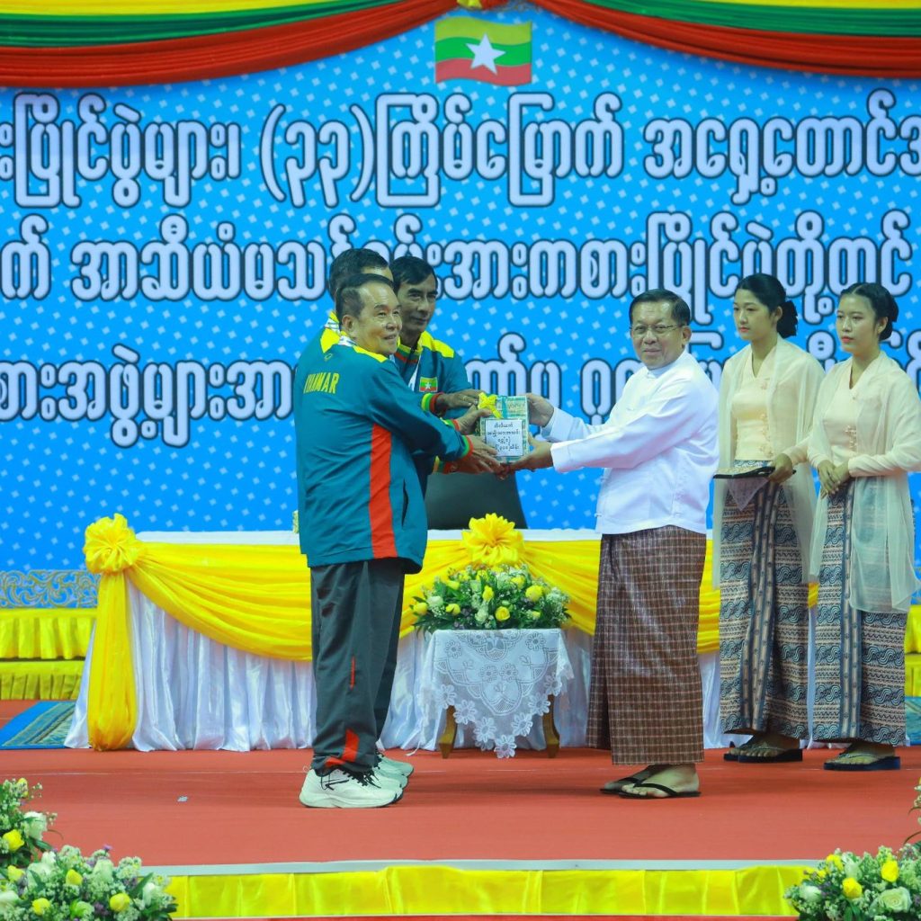 ထို့နောက် (၈) ကြိမ်မြောက် ကမ္ဘာ့ဗိုဗီနမ်ချန်ပီယံရှစ်ပြိုင်ပွဲ၊ (၁၆) ကြိမ်မြောက် ကမ္ဘာ့ကာယဗလနှင့် ကာယကြံ့ခိုင်မှုအားကစားပြိုင်ပွဲ၊ (၃၃) ကြိမ်မြောက် အရှေ့တောင်အာရှအားကစားပြိုင်ပွဲနှင့် (၁၃) ကြိမ်မြောက် အာဆီယံမသန်စွမ်းအားကစားပြိုင်ပွဲတို့တွင် နိုင်ငံ့ဂုဏ်ဆောင်ခဲ့သည့် အားကစားသမား မောင်မယ်များအား နိုင်ငံတော်မှ ဂုဏ်ပြုချီးမြှင့်ပွဲအခမ်းအနားကို ကျင်းပပြုလုပ်ရာ နိုင်ငံတော်ယာယီသမ္မတ နိုင်ငံတော်လုံခြုံရေးနှင့် အေးချမ်းသာယာရေးကော်မရှင်ဥက္ကဋ္ဌက (၈) ကြိမ်မြောက် ကမ္ဘာ့ဗိုဗီနမ်ချန်ပီယံရှစ်ပြိုင်ပွဲတွင် ရွှေတံဆိပ်နှစ်ခုရရှိခဲ့ကြသည့် မမေဟန်နီအောင်လွင်နှင့် မနှင်းသက်ဝေ၊ (၁၆) ကြိမ်မြောက် ကမ္ဘာ့ကာယဗလနှင့် ကာယကြံ့ခိုင်မှုအားကစားပြိုင်ပွဲ၊ Men Bodybuilding 75 kg ပြိုင်ပွဲ၌ ရွှေတံဆိပ်တစ်ခုရရှိခဲ့သည့် မောင်ရဲထွန်းနောင်၊ (၃၃) ကြိမ်မြောက် အရှေ့တောင်အာရှအားကစားပြိုင်ပွဲ ခြင်းလုံးအားကစားနည်းတွင် အမျိုးသားအသင်းလိုက် Event-3 ပြိုင်ပွဲတွင် ရွှေတံဆိပ်တစ်ခုရရှိခဲ့သည့် အမျိုးသားအသင်းနှင့် အမျိုးသမီးအသင်းလိုက် Event-3 ပြိုင်ပွဲတွင် ရွှေတံဆိပ်တစ်ခုရရှိခဲ့သည့် အမျိုးသမီးအသင်း၊ ဘိလိယက်နှင့် စနူကာအားကစားနည်းတွင် ဘိလိယက်အမျိုးသားအသင်းလိုက်ပြိုင်ပွဲ၌ ရွှေတံဆိပ်တစ်ခုရရှိခဲ့သည့် ဘိလိယက်အမျိုးသား အသင်း၊ (၁၃) ကြိမ်မြောက် အာဆီယံမသန်စွမ်းအားကစားပြိုင်ပွဲ ရေကူးအားကစားနည်းတွင် မီတာ ၂၀၀ အလွတ်ကူး၊ မီတာ ၅၀ ရင်ပေါင်တန်းကူး၊ မီတာ ၅၀ အလွတ်ကူး၊ မီတာ ၁၀၀ အလွတ်ကူးပြိုင်ပွဲ လေးမျိုးလုံး၌ ရွှေတံဆိပ်လေးခုရရှိသည့် မောင်ညီညီလင်းထက်၊ မီတာ ၁၀၀ ရင်ပေါင်တန်းကူးပြိုင်ပွဲတွင် ရွှေတံဆိပ်တစ်ခုနှင့် မီတာ ၅၀ ရင်ပေါင်တန်းကူးပြိုင်ပွဲတွင် ငွေတံဆိပ်တစ်ခုရရှိခဲ့သည့် မောင်နန္ဒ စိုးမင်း၊ အလွတ်ကူးပြိုင်ပွဲများတွင် ရွှေတံဆိပ်တစ်ခုနှင့် ငွေတံဆိပ်တစ်ခုရရှိခဲ့သည့် ဒုတိယတပ်ကြပ် စိုးဝင်း၊ ရင်ပေါင်တန်းကူးပြိုင်ပွဲများတွင် ရွှေတံဆိပ်တစ်ခုနှင့် ငွေတံဆိပ်တစ်ခုရရှိခဲ့သည့် မောင်မင်းထူး၊ မီတာ ၁၀၀ ပက်လက်ကူးပြိုင်ပွဲတွင် ရွှေတံဆိပ်တစ်ခုနှင့် မီတာ ၂၀၀ အလွတ်ကူးပြိုင်ပွဲတွင် ကြေးတံဆိပ်နှစ်ခုရရှိခဲ့သည့် မောင်အောင်မြင့်မြတ်၊ ပြေးခုန်ပစ်အားကစားနည်းတွင် သံလုံးပစ်နှင့် လှံတံပစ်ပြိုင်ပွဲတို့၌ ရွှေတံဆိပ်နှစ်ခုရရှိခဲ့သည့် ဒုတိယအရာခံဗိုလ် တင်ညို၊ မီတာ ၄၀၀ ပြိုင်ပွဲတွင် ရွှေတံဆိပ်တစ်ခု၊ မီတာ ၂၀၀ ပြိုင်ပွဲတွင် ငွေတံဆိပ်တစ်ခု၊ မီတာ ၁၀၀ ပြိုင်ပွဲတွင် ကြေးတံဆိပ်တစ်ခုရရှိခဲ့သည့် မောင်အောင်မြင့်ဌေး၊ မီတာ ၂၀၀ ပြိုင်ပွဲတွင် ရွှေတံဆိပ်တစ်ခု၊ ငွေတံဆိပ်တစ်ခုရရှိသည့် တပ်ကြပ်ကြီး စိုးပေ၊ သံပြားပစ်နှင့် သ