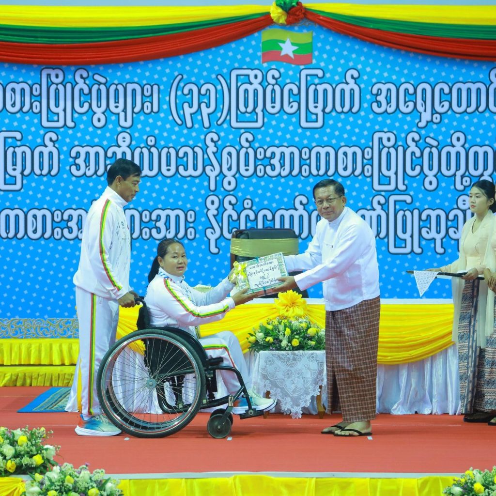 ၂၀၂၃ ခုနှစ် ကမ္ဘောဒီးယားနိုင်ငံတွင် ကျင်းပခဲ့သည့် (၁၂) ကြိမ်မြောက် အာဆီယံမသန်စွမ်း အားကစားပြိုင်ပွဲတွင် မြန်မာနိုင်ငံက ရွှေ ၁၅ ခုအပါအဝင် စုစုပေါင်း ဆုတံဆိပ် ၅၇ ခုရရှိပြီး နိုင်ငံအလိုက် အဆင့် (၆) ရရှိ ခဲ့သည်ကို တွေ့ရှိရပါကြောင်း၊ ထို့ကြောင့် ယခု (၁၃) ကြိမ်မြောက် အာဆီယံမသန်စွမ်းအားကစားပြိုင်ပွဲတွင် ယခင်အကြိမ်ကထက် ရွှေတံဆိပ်ငါးခု ပိုမိုဆွတ်ခူးရရှိခဲ့ခြင်းဖြစ်ပြီး စုစုပေါင်းဆုတံဆိပ်အရေအတွက် နှစ်ခုပိုမိုဆွတ်ခူးရရှိခဲ့သည်ကိုလည်း တွေ့ရှိရပါကြောင်း၊ ထို့ကြောင့် ယခုကဲ့သို့ ကြိုးစားယှဉ်ပြိုင်မှုနှင့် အောင်မြင်မှုများကို ဂုဏ်ပြုသည့်အနေဖြင့် နိုင်ငံတော်က ပြိုင်ပွဲယှဉ်ပြိုင်နေစဉ်ကာလအတွင်း ရွှေတံဆိပ်တစ်ခုရရှိပါက အမေရိကန်ဒေါ်လာ ၃၀၀၊ ငွေတံဆိပ်တစ်ခုရရှိပါက အမေရိကန်ဒေါ်လာ ၂၀၀၊ ကြေးတံဆိပ်တစ်ခုရရှိပါက အမေရိကန်ဒေါ်လာ ၁၀၀ ချက်ချင်းချီးမြှင့်ခဲ့ပါကြောင်း။