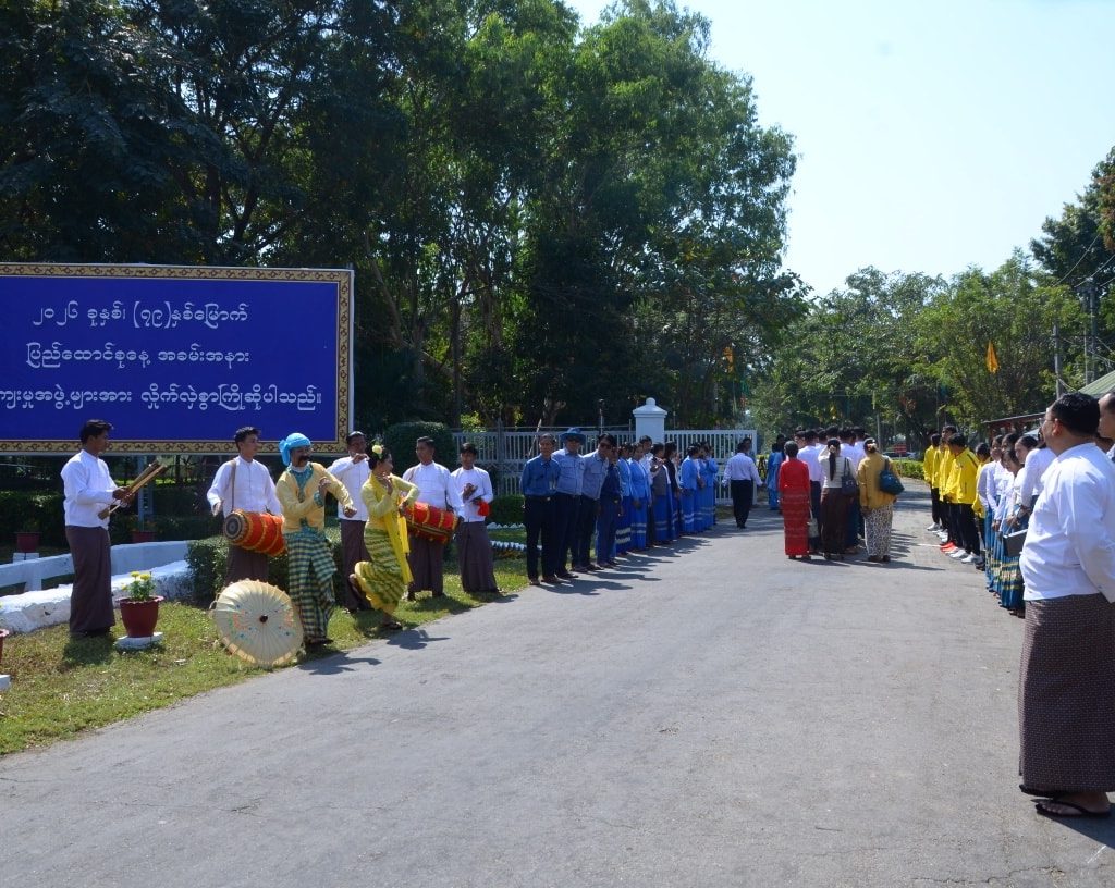 (၇၉)နှစ်မြောက် ပြည်ထောင်စုနေ့ အခမ်းအနားကျင်းပရေး ယဉ်ကျေးမှုအဖွဲ့များ ကြိုဆိုနေရာချထားရေးနှင့် ဧည့်ခံကျွေးမွေးရေးဆပ်ကော်မတီ ဥက္ကဋ္ဌ၊ အားကစားနှင့်လူငယ်ရေးရာဝန်ကြီးဌာန ဒုတိယဝန်ကြီး ဦးထိန်လင်းသည် အားကစားနှင့်ကာယပညာဦးစီးဌာန ညွှန်ကြားရေးမှူးချုပ် ဦးဉာဏ်ဇော်ဦး၊ ကြိုဆိုနေရာချထားရေးနှင့် ဧည့်ခံကျွေးမွေးရေးဆပ်ကော်မတီအဖွဲ့ဝင်များ၊ ဌာနဆိုင်ရာ များမှ တာဝန်ရှိပုဂ္ဂိုလ်များ၊ ဝန်ထမ်းများနှင့်အတူ ယနေ့မွန်းလွဲပိုင်းတွင် ပြည်ထောင်စုနေ့အခမ်းအနား သို့ တက်ရောက်ရန်အတွက် ပြည်ထောင်စုနယ်မြေ နေပြည်တော်စည်ပင်ဧည့်ရိပ်သာသို့ တိုင်းဒေသကြီးနှင့်ပြည်နယ် ကိုယ်စားပြုရောက်ရှိလာသည့် ယဉ်ကျေးမှုအဖွဲ့များအား နွေးထွေး လှိုက်လှဲစွာ ကြိုဆိုနှုတ်ဆက်ခဲ့သည်။