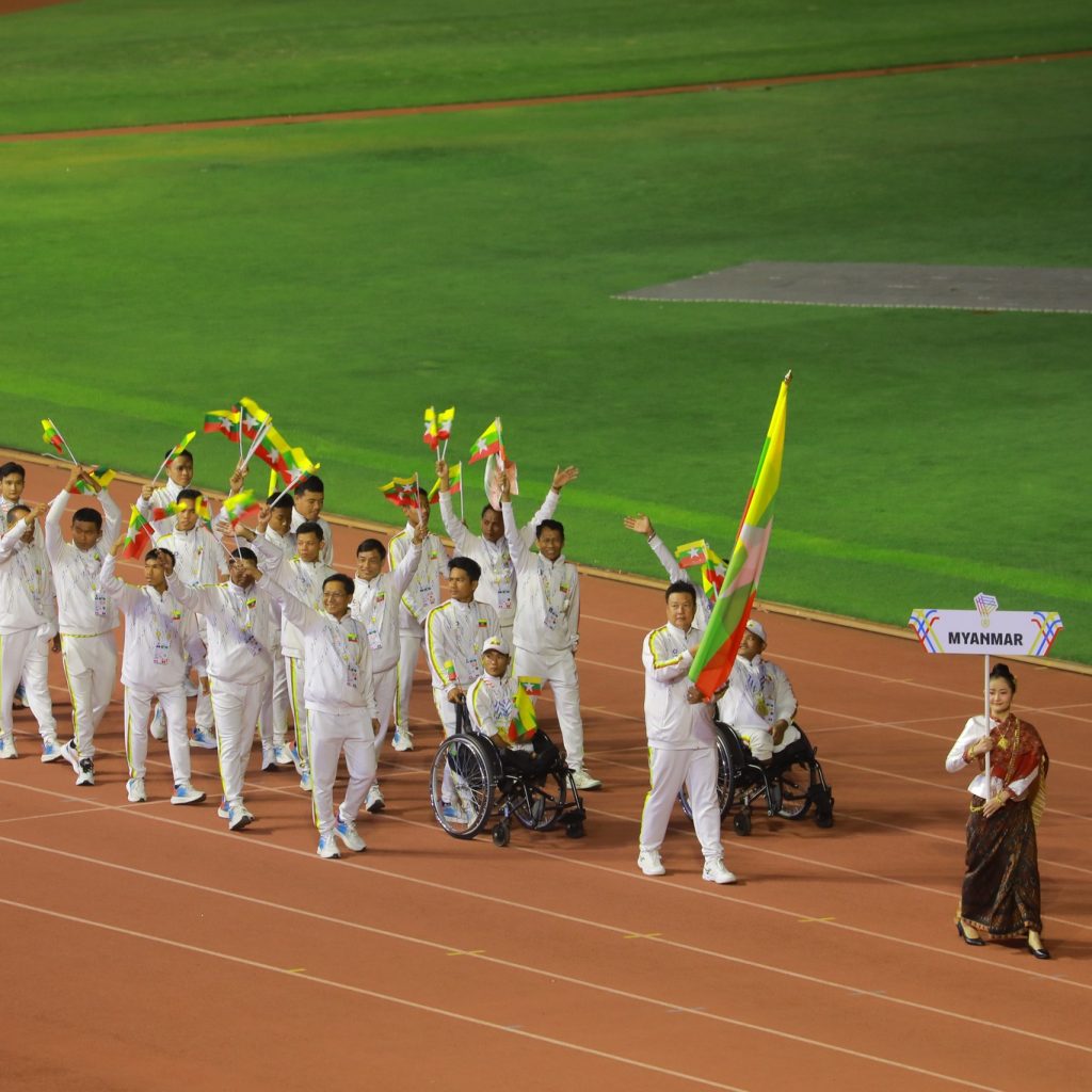 ထိုင်းနိုင်ငံက အိမ်ရှင်အဖြစ်လက်ခံကျင်းပသည့် (၁၃)ကြိမ်မြောက် အာဆီယံမသန်စွမ်းအားကစားပြိုင်ပွဲ ပိတ်ပွဲအခမ်းအနားကို ယနေ့ည ဒေသစံတော်ချိန် ညနေ(၆)နာရီတွင် ထိုင်းနိုင်ငံ၊ နာခွန်ရစ်ချာဆီးမား(ခိုရတ်)မြို့ရှိ Majesty the King’s 80th Birthday Anniversary Commemorative Stadium ၌ ကျင်းပခဲ့ရာ မြန်မာနိုင်ငံမသန်စွမ်းအားကစားအဖွဲ့ချုပ် ဥက္ကဋ္ဌ ဗိုလ်ချုပ်လှမိုး ဦးဆောင်သည့် မြန်မာမသန်စွမ်းအားကစားအဖွဲ့မှ အုပ်ချုပ်သူ/နည်းပြများနှင့် အားကစားသမားများ၊ နိုင်ငံအသီးသီးမှ တာဝန်ရှိပုဂ္ဂိုလ်များ၊ ပြိုင်ပွဲဝင်အသင်းများမှ အုပ်ချုပ်သူ/နည်းပြများနှင့် အားကစားသမားများ တက်ရောက်ခဲ့သည်။