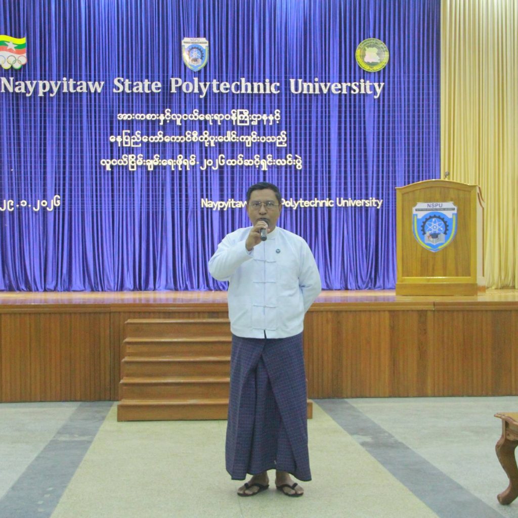 အားကစားနှင့်လူငယ်ရေးရာဝန်ကြီးဌာနနှင့် နေပြည်တော်ကောင်စီတို့ ပူးပေါင်းကျင်းပသည့် လူငယ်ငြိမ်းချမ်းရေးဖိုရမ် ၂၀၂၆ သို့ တက်ရောက်ခဲသည့် နေပြည်တော်ကောင်စီ လူငယ်ကိုယ်စားလှယ်များက အတွေ့အကြုံများအား ထပ်ဆင့်ရှင်းလင်းပွဲအခမ်းအနားကို ယနေ့နံနက်ပိုင်းတွင် Naypyitaw State Polytechnic University ၌ ကျင်းပခဲ့ရာ နေပြည်တော်ကောင်စီဝင်များဖြစ်ကြသည့် ဦးမြင့်စိုး၊ ဦးမင်းဦး၊ လူငယ်ရေးရာဦးစီးဌာန ညွှန်ကြားရေးမှူးချုပ် ဦးကျော်စိုးမိုး၊ အမျိုးသားစည်းလုံးညီညွတ် ရေးနှင့် ငြိမ်းချမ်းရေးဖော်ဆောင်မှုညှိနှိုင်းကော်မတီ ဒုတိယဗိုလ်ချုပ်ကြီး ဝင်းဘိုရှိန်(ငြိမ်း)နှင့် ဗိုလ်ချုပ် စိုးနိုင်ဦး(ငြိမ်း)၊ နေပြည်တော်ဌာနဆိုင်ရာများမှ တာဝန်ရှိသူများ၊ Naypyitaw State Polytechnic University မှ ပါမောက္ခချုပ်နှင့် ဒုတိယပါမောက္ခချုပ်၊ ဆရာ/ဆရာမများနှင့် ကျောင်းသား/ကျောင်းသူများ၊ လူငယ်ငြိမ်းချမ်းရေးဖိုရမ် ၂၀၂၆ သို့ တက်ရောက်ခဲသည့် နေပြည်တော်ကောင်စီ လူငယ်ကိုယ်စားလှယ်များ တက်ရောက်ခဲ့သည်။