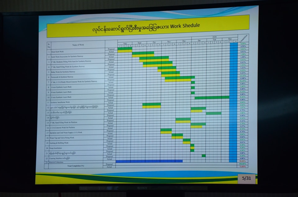 ဦးစွာ အားကစားနှင့်ကာယပညာဦးစီးဌာန ညွှန်ကြားရေးမှူးချုပ် ဦးဉာဏ်ဇော်ဦးက အဖွင့်အမှာ စကားပြောကြားရာတွင် ၂၀၂၅-၂၀၂၆ ဘဏ္ဍာရေးနှစ် ပြည်ထောင်စု ငွေလုံးငွေရင်းခွင့်ပြုရန်ပုံငွေဖြင့် ဆောင်ရွက်သည့် တည်ဆောက်ရေးလုပ်ငန်း ၂၃ ခု၊ နှစ်ဆက်လုပ်ငန်း ၁ ခုနှင့် Third Party (QA/QC) ငှားရမ်းခြင်းလုပ်ငန်း ၆ ခု၏ သက်ဆိုင်ရာကုမ္ပဏီများအား မြေပြင်၌ လုပ်ငန်းဆောင်ရွက်မှုအခြေအနေ များနှင့် လုပ်ငန်းအခက်အခဲများ တင်ပြနိုင်ရန်အတွက် ယခုအစည်းအဝေးအားကျင်းပရခြင်းဖြစ်ကြောင်း၊ တည်ဆောက်ရေးလုပ်ငန်းများအနက် လုပ်ငန်း ၁၃ ခုမှာ ၁၀၀% ဆောင်ရွက်ပြီးစီးပြီဖြစ်ကြောင်း၊ ကျန်လုပ်ငန်းများလည်း သတ်မှတ်သည့်အချိန်တွင် အချိန်မီ ပြီးစီးစေလိုကြောင်း၊ ဆောင်ရွက်ပြီးစီးမှု ရာခိုင်နှုန်းအလိုက် ငွေတောင်းခံမှုများအား စိစစ်ပြီး အရစ်ကျထုတ်ပေးပြီးဖြစ်ကြောင်း၊ တည်ဆောက်ရေး လုပ်ငန်းများကို အရှိန်အဟုန်ဖြင့် ဆောင်ရွက်နိုင်ရေးနှင့် သတ်မှတ်ကာလထက် စောပြီးနိုင်ရေး ဆောင်ရွက်ရန် တိုက်တွန်းမှာကြားလိုကြောင်း၊ သက်ဆိုင်ရာ အရည်အသွေးစစ်ဆေးရေးနှင့် ထိန်းသိမ်းရေး QC ကုမ္ပဏီများအနေဖြင့်လည်း တည်ဆောက်ရေးဆောင်ရွက်လျက်ရှိသည့် မြေပြင်၌ လုပ်ငန်းဆောင်ရွက် နေမှုအခြေအနေများအား စစ်ဆေးနိုင်ရေးအတွက် တာဝန်ခံအင်ဂျင်နီယာများ အချိန်ပြည့် ထားရှိဆောင်ရွက် ပေးရန်လိုကြောင်း၊ တည်ဆောက်ရေးလုပ်ငန်းများ ဆောင်ရွက်ရာ၌ အခက်အခဲများရှိပါက အချိန်နှင့် တစ်ပြေးညီ တင်ပြဆောင်ရွက်သွားရန်လိုကြောင်း၊ ကုမ္ပဏီများမှ တင်ပြခဲ့သည့် Work Schedule များ အတိုင်း လုပ်ငန်းပြီးစီးရန်လိုကြောင်း ပြောကြားခဲ့သည်။