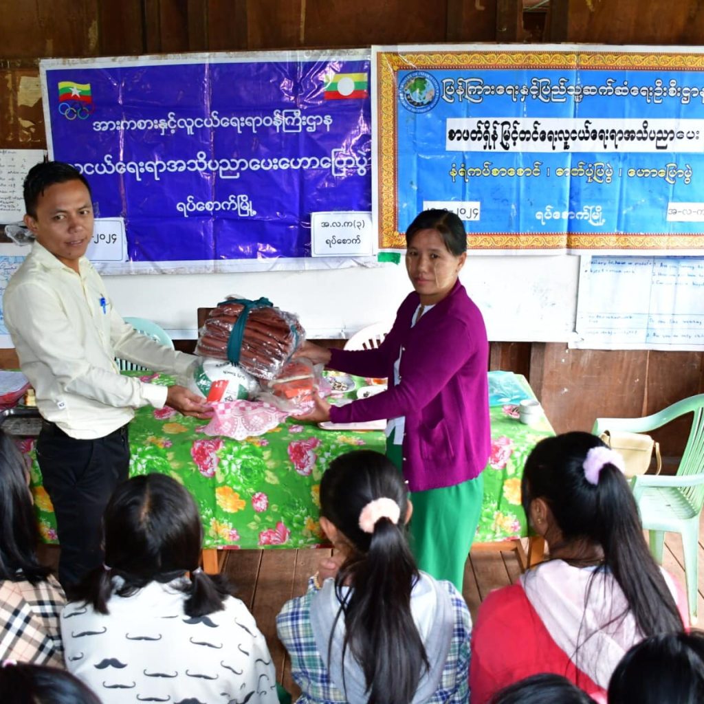 ထို့နောက် မြို့နယ်အားကစားမှူးက ကျောင်းသားကျောင်းသူများအတွက် အားကစားပစ္စည်းများပေးအပ်လှူဒါန်းခြင်း၊ မြို့နယ်ပြန်ကြားရေးနှင့်ပြည်သူ့ဆက်ဆံရေးဦးစီးဌာန ဦးစီးအရာရှိတို့မှ စာအုပ်/စာစောင်များ လှူဒါန်းရာ ကျောင်းအုပ်ဆရာမကြီးက လက်ခံရယူခဲ့ပါသည်။