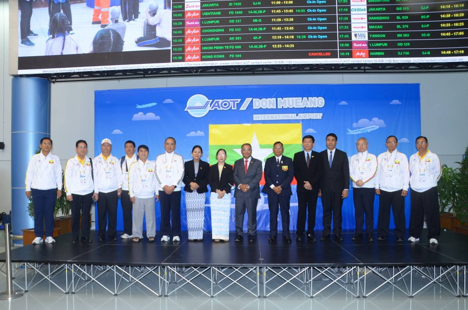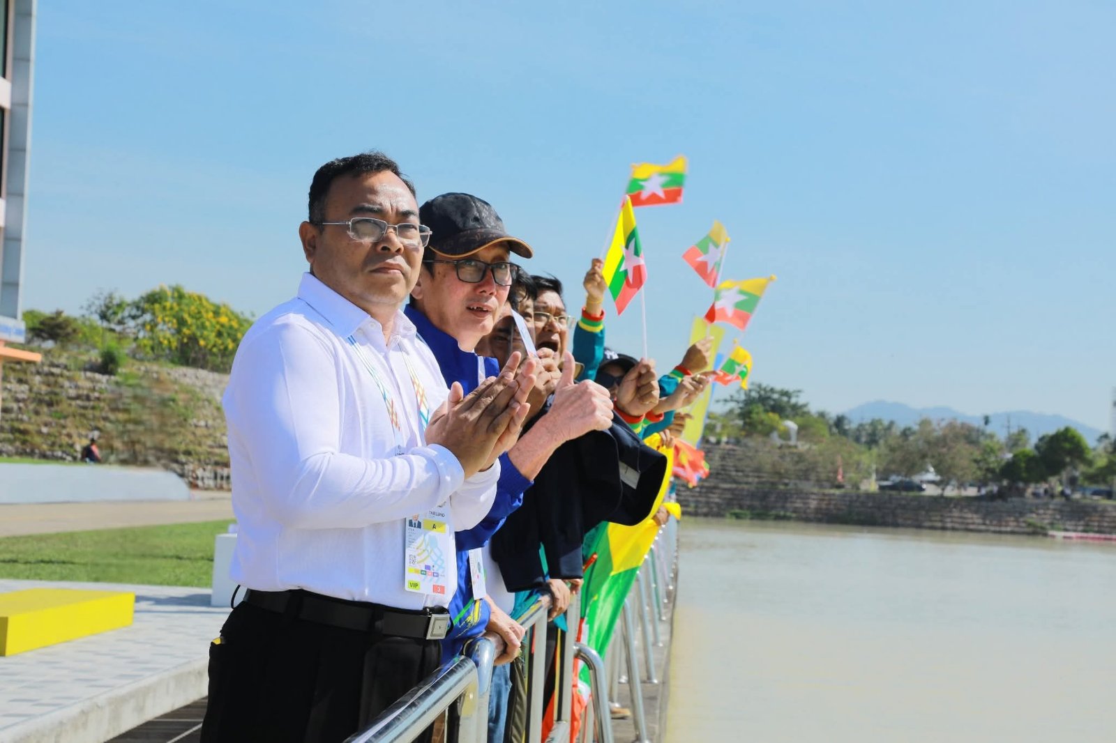 ပြည်ထောင်စုသမ္မတမြန်မာနိုင်ငံတော် ယာယီသမ္မတ နိုင်ငံတော်လုံခြုံရေးနှင့် အေးချမ်းသာယာရေးကော်မရှင်ဥက္ကဋ္ဌ ဗိုလ်ချုပ်မှူးကြီး မင်းအောင်လှိုင် (၃၃)ကြိမ်မြောက် အရှေ့တောင်အာရှ အားကစားပြိုင်ပွဲသို့ ဝင်ရောက်ယှဉ်ပြိုင်မည့် မြန်မာအားကစားအဖွဲ့အား အောင်နိုင်ရေးအလံအပ်နှင်းပွဲ အခမ်းအနားသို့ တက်ရောက်အမှာစကားပြောကြား